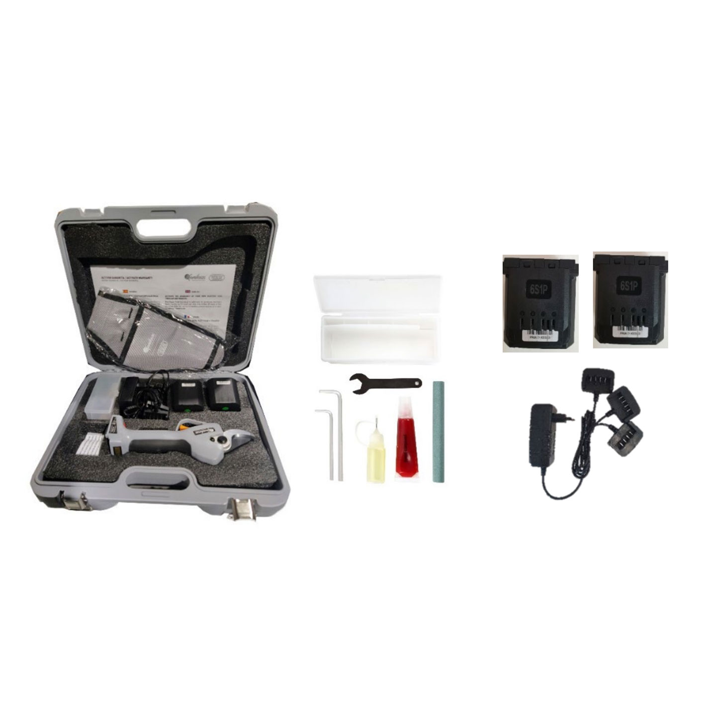 Incluye maletín, cargador triple, x2 baterías y kit de herramientas.
